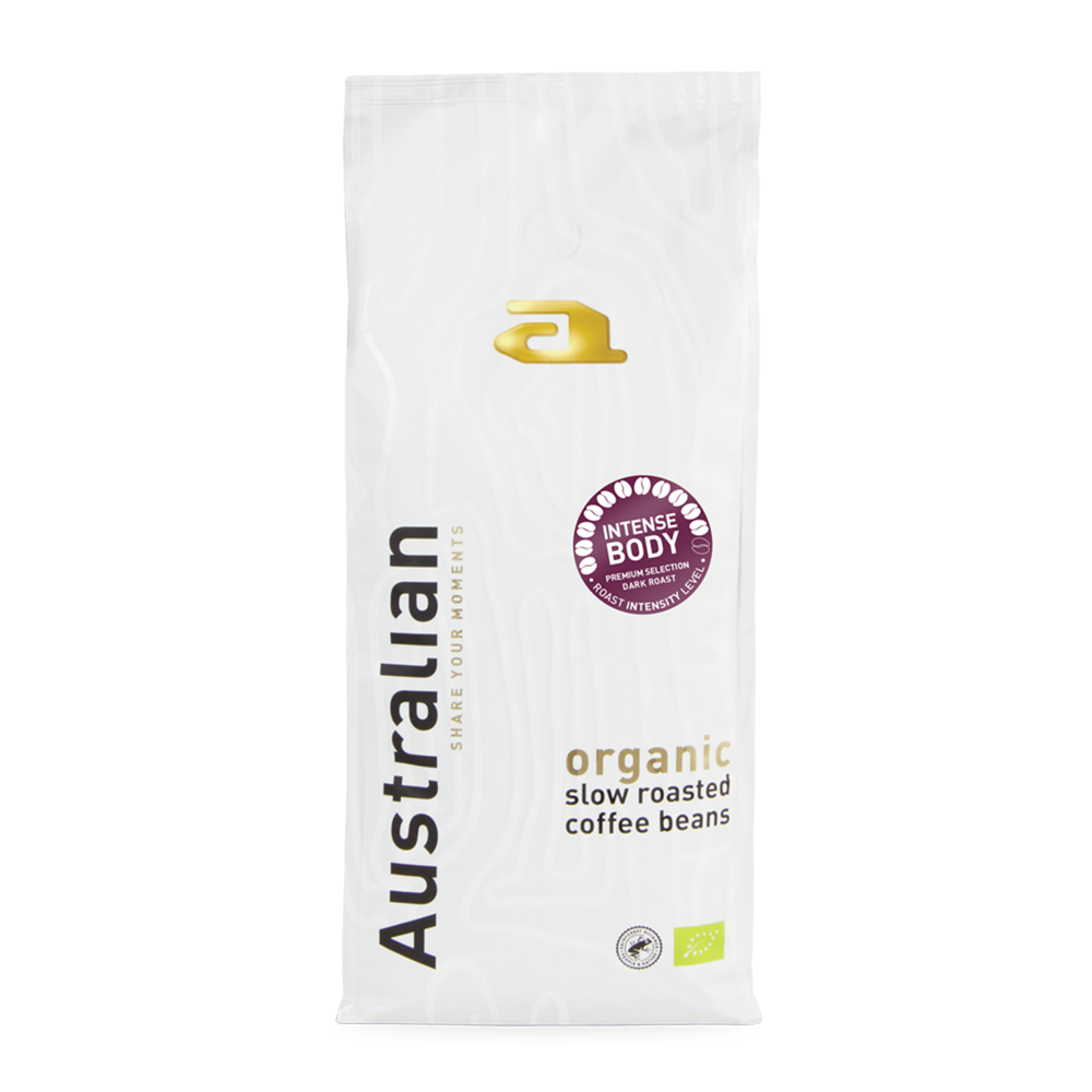 Biologische koffiebonen, donker gebrand. Stevig en intens met tonen van chocolade en karamel. Intensiteit: 11 uit 12.