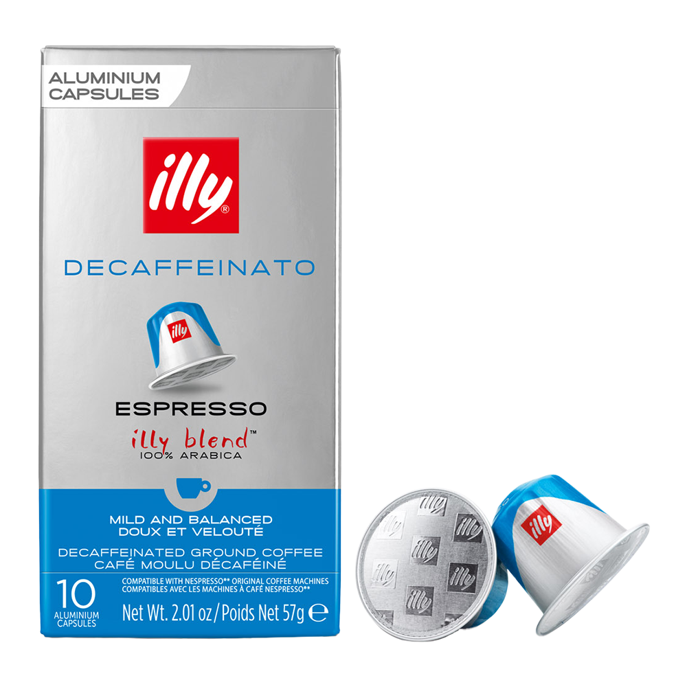De cafeïnevrije gebrande illy Decaffeinato heeft een zachte en fluweelachtige smaak, met een cafeïnegehalte van minder dan 0,1%.